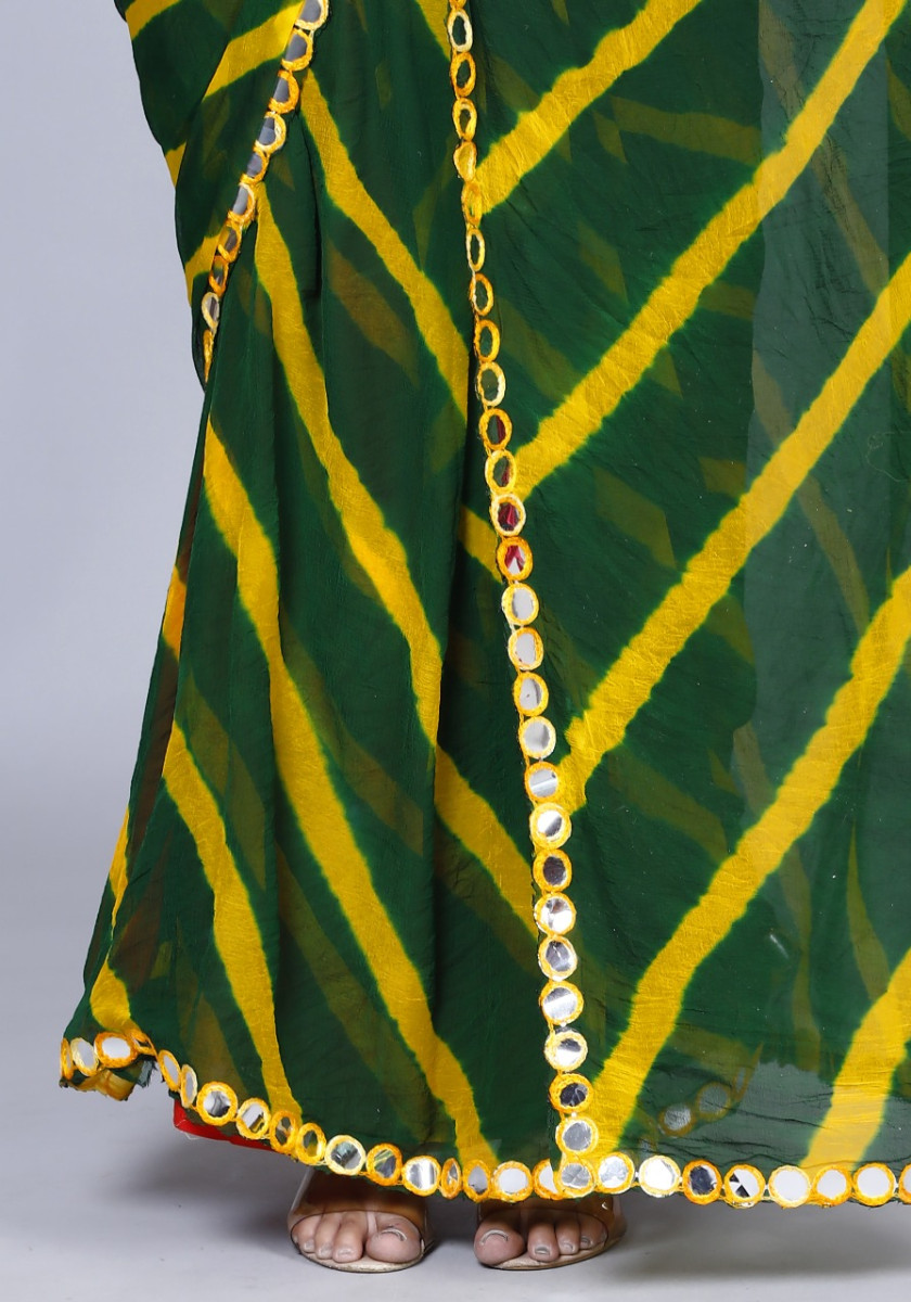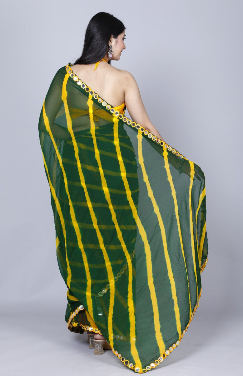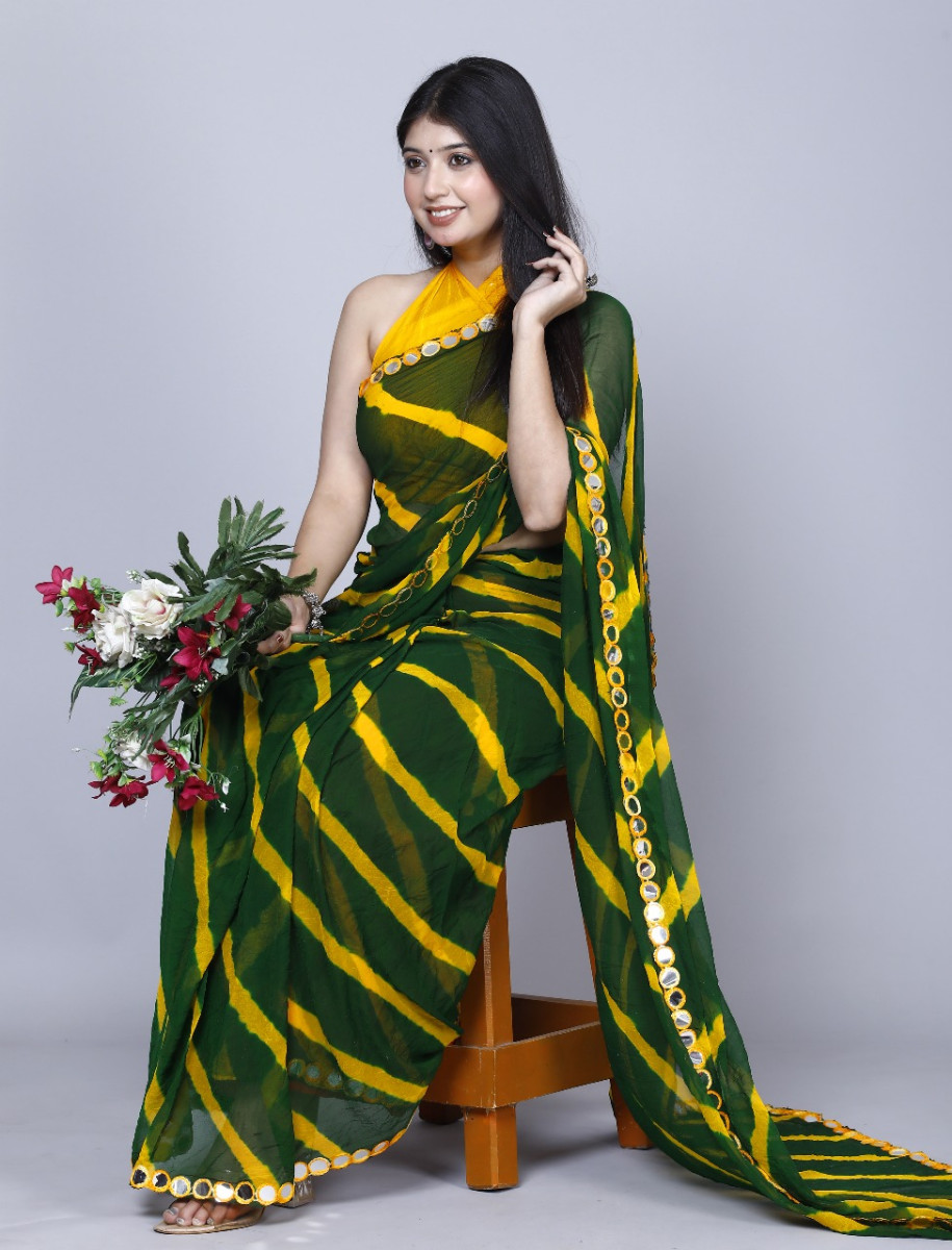 Pure Chiffon Leheriya Mirror Work Printed Work Sarees For Women