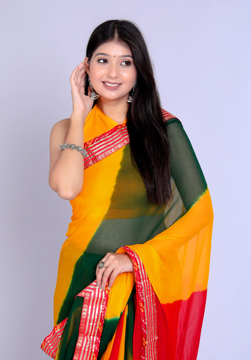 Pure Chiffon Leheriya Saree for Women – Bollywood Style Printed Lehaiya Saree with Gotta Border | Party, Wedding & Festive Wear