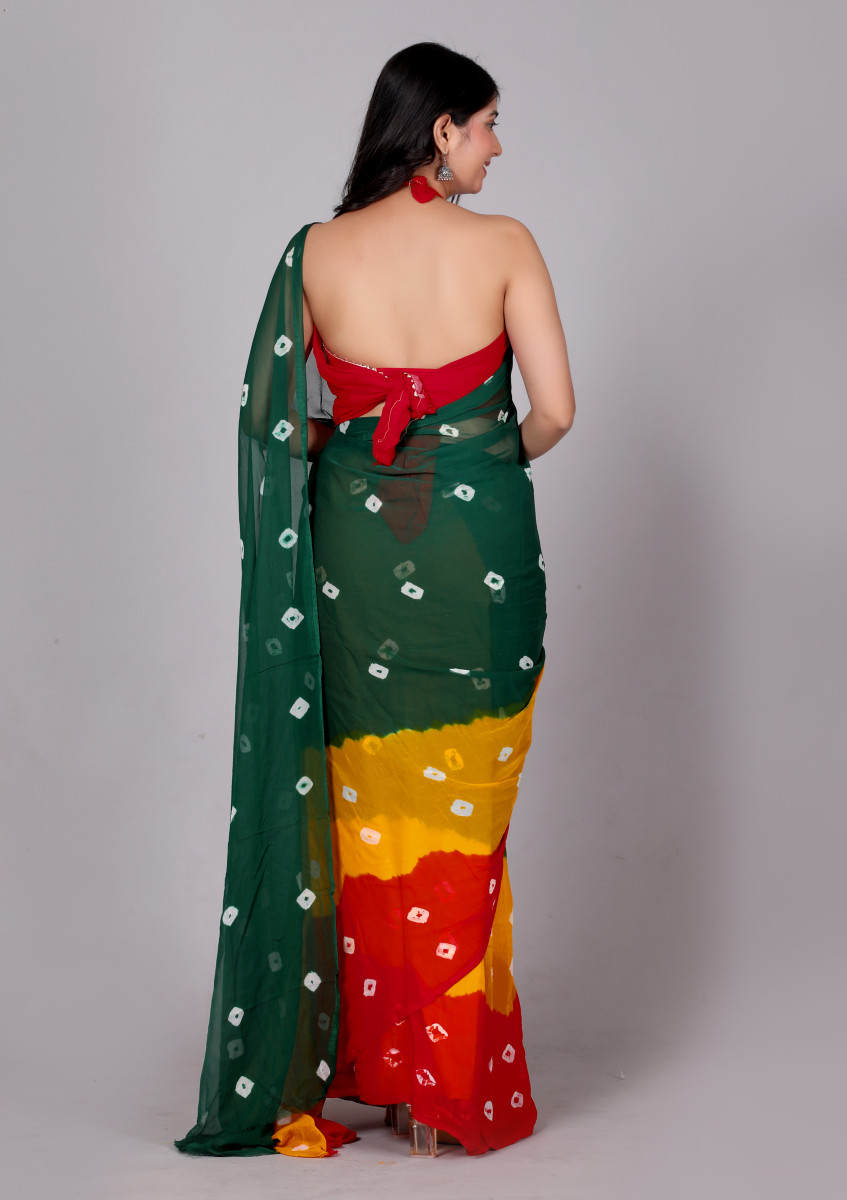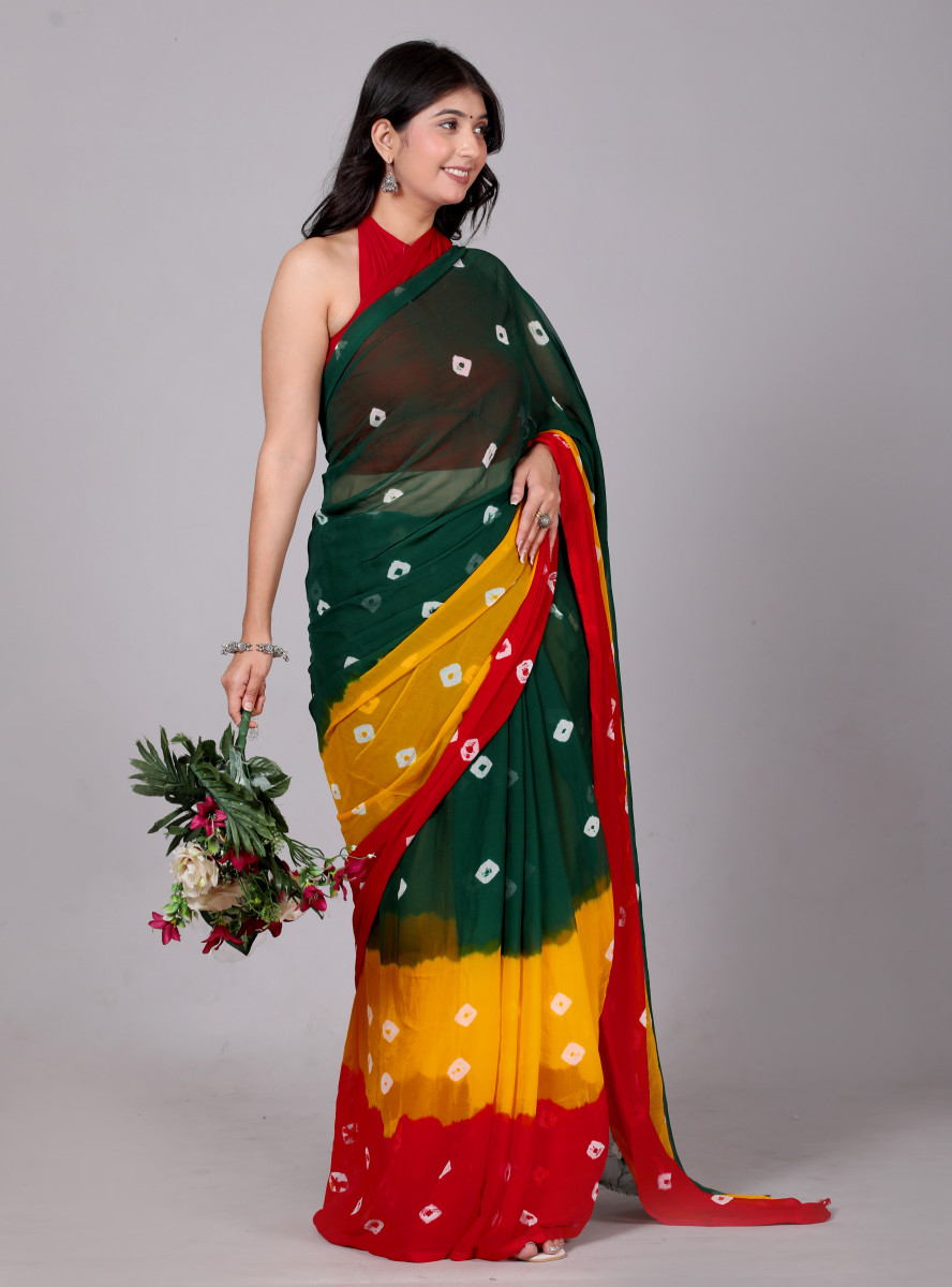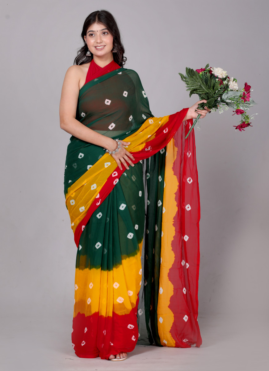 Bandhani Printed Chiffon Printed Red sarees For Women(Red,Yellow,Green)