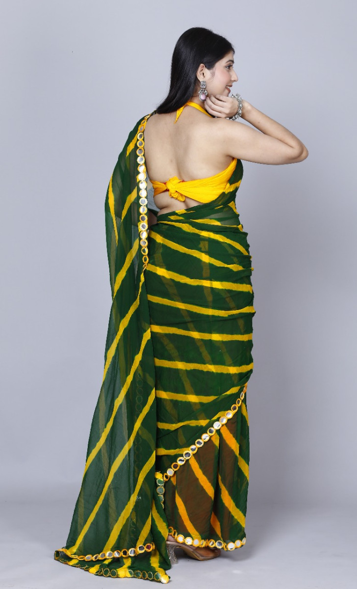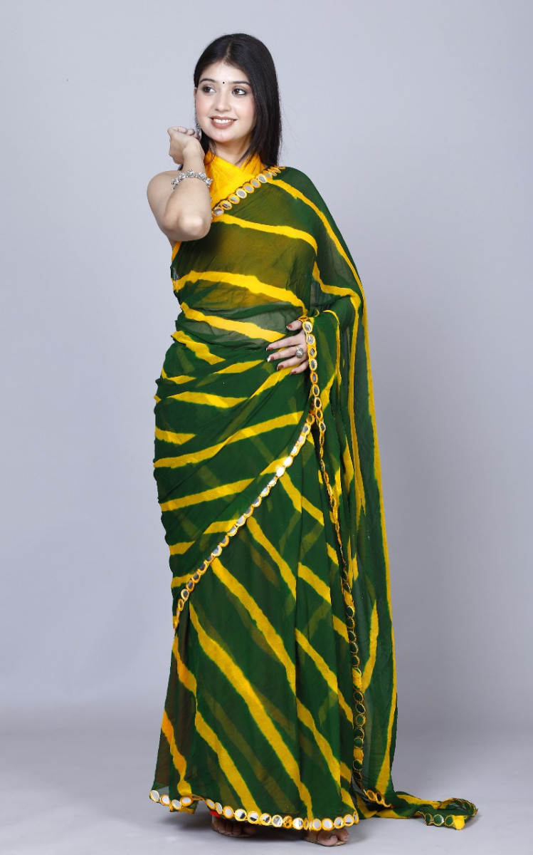 Pure Chiffon Leheriya Mirror Work Printed Work Sarees For Women